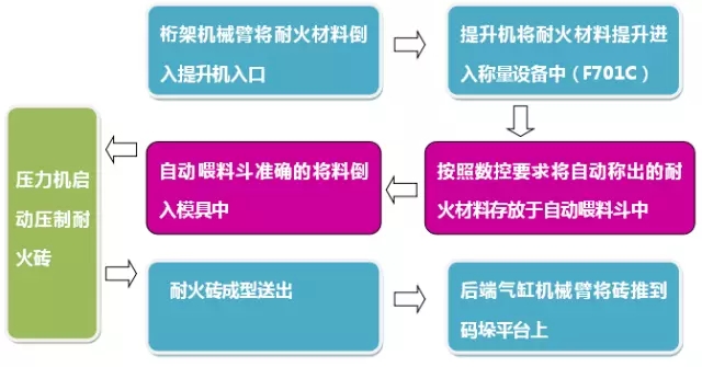 現有人工生產工藝為:粉料上料稱量—粉料倒入壓機模具—壓力機工作—取模—清潔模具—成品檢測,依托同類型鎂碳型耐火磚設計的全自動化生產線的經驗,針對現有工藝進行解決方案的定制。